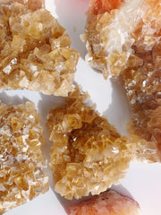 Honey Calcite also known as Golden or Amber Calcite is a calcium carbonate mineral that occurs in masses and rhombohedral forms.